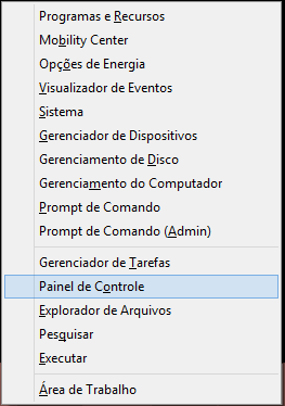No desktop, aperte Windows + X para abrir o menu. Vá em Painel de Controle.
