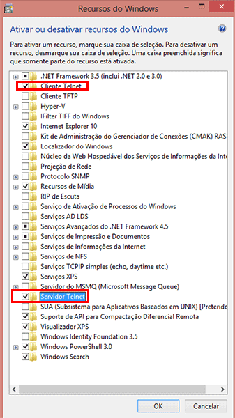 Na janela que se abrir, marque as opções “Cliente Telnet” e “Servidor Telnet”. Clique em OK.