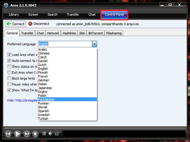 Após realizar o download e instalar o Ares, execute-o. O software, por definição padrão, vai estar em inglês, mas é possível alterar para o português. Realize os seguintes passos para trocar o idioma: